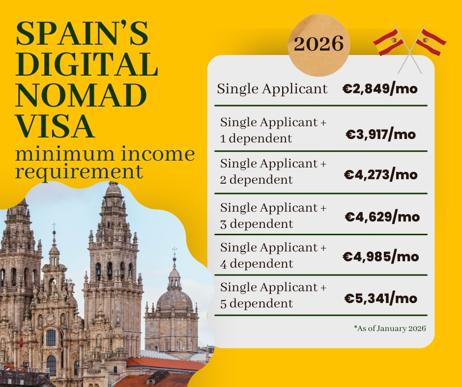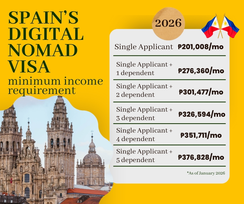 If you're applying from either the Spanish Embassy/Consulate in the Philippines or Directly in Spain UGE the annual gross income is €34,188 (Approx. ₱2,400,000). Keep in mind that if you’re including dependents — like a spouse or children — you’ll need to show additional income, which we break down in more detail below.